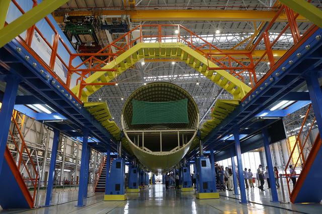 截至2014年8月,C919已獲得400架訂單那C919優(yōu)勢何在?中國商飛上海飛機設(shè)計研究院總體氣動設(shè)計研究部部長黃煒將C919的優(yōu)勢定義為“安全、舒適、經(jīng)濟和環(huán)保”,減阻5%、減排50%、減重2%,發(fā)動機比現(xiàn)在正在運營的同等座級的機型降低燃油消耗12%-15%。圖為C919大型客機開始結(jié)構(gòu)總裝。